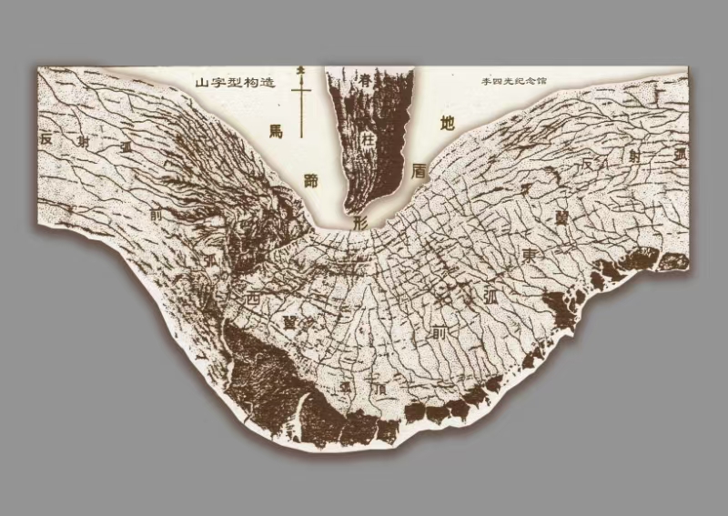 李四光在《地质力学方法》中提出多字型、帚状、山字型、入字型等多种构造型式。他认为“山字型构造”可能是发育最广泛,也是对地壳运动的研究最有用的。山字型构造体系,主要由前弧、反射弧、脊柱和马蹄形盾地几部分组成。它反映了当大陆整体向赤道挤压前进时,在某些地方或地点,遇到了对称或不很对称的阻力,在两个阻力点之间,就出现了凸出的前弧。凹侧的脊柱,指向前弧的顶部,但不会穿过弧顶。一个山字型展布的范围及其深度,正是这个地区构造应力场和地应力长期作用所显示的结果。